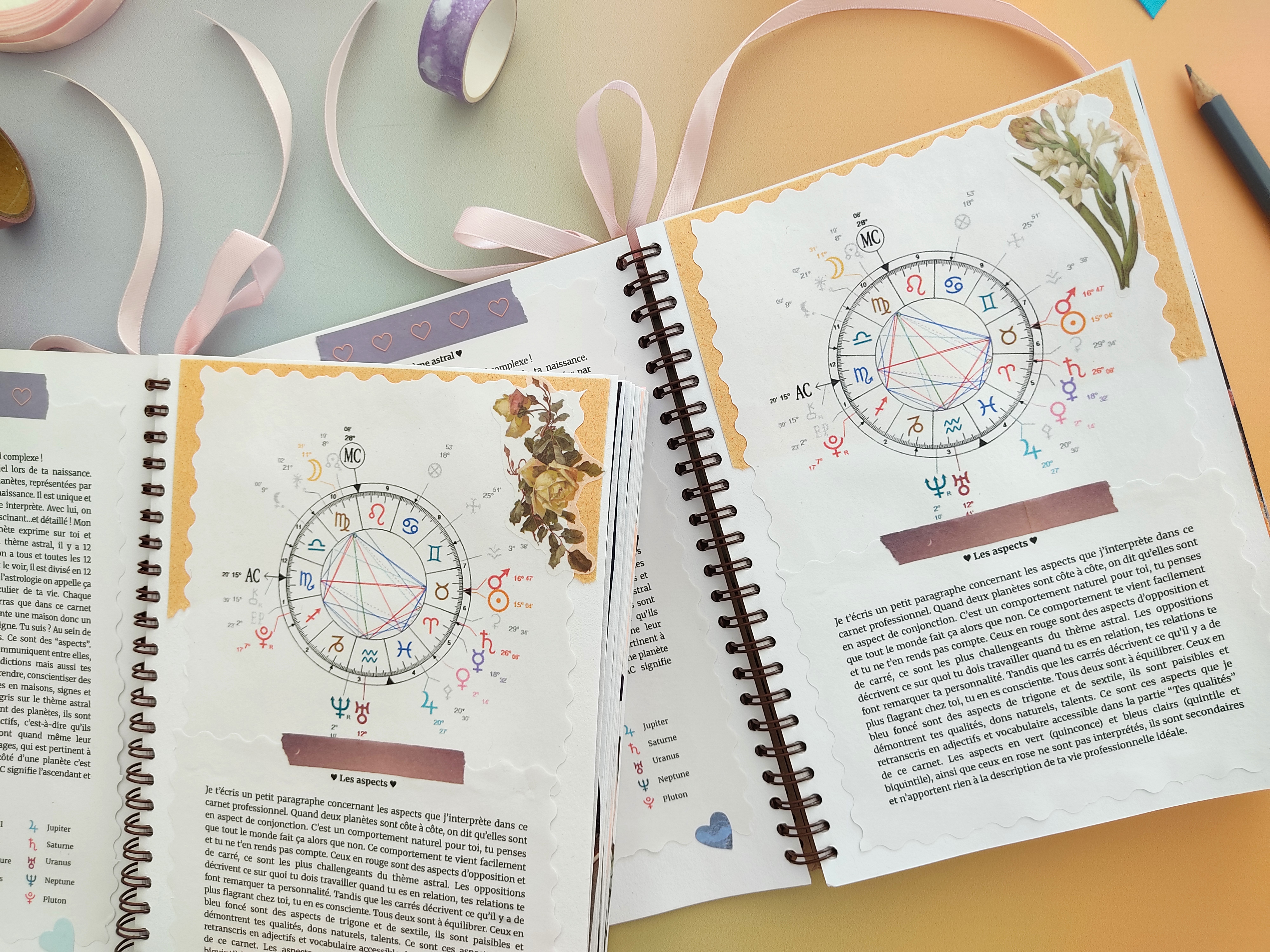 Depuis maintenant 5 ans, j’étudie l’astrologie en autodidacte. C’est une grande passion pour moi puisqu’elle me permet de comprendre davantage l’être humain en détails. L’astrologie ce n’est pas les horoscopes… C’est bien plus vaste et complexe qu’on le pense. Ce qui a commencé par un hobby est désormais mon métier, je veux te transmettre tout mon savoir (compilé sur un document de plus de 500 pages haha) avec un format inédit : le carnet scrapbooking ! Tout a commencé avec Shana Lyès (Astro Lya pour celles qui l’ont connue) qui m’a transmis sa passion pour cet art et m’a rendue très curieuse d’en apprendre plus. J’ai beaucoup appris avec les réseaux sociaux, en français et en anglais. Ma plus grande inspiration restera toujours Jewel de la chaîne Youtube « Truth in Aspect Astrology » que je trouve remarquable.