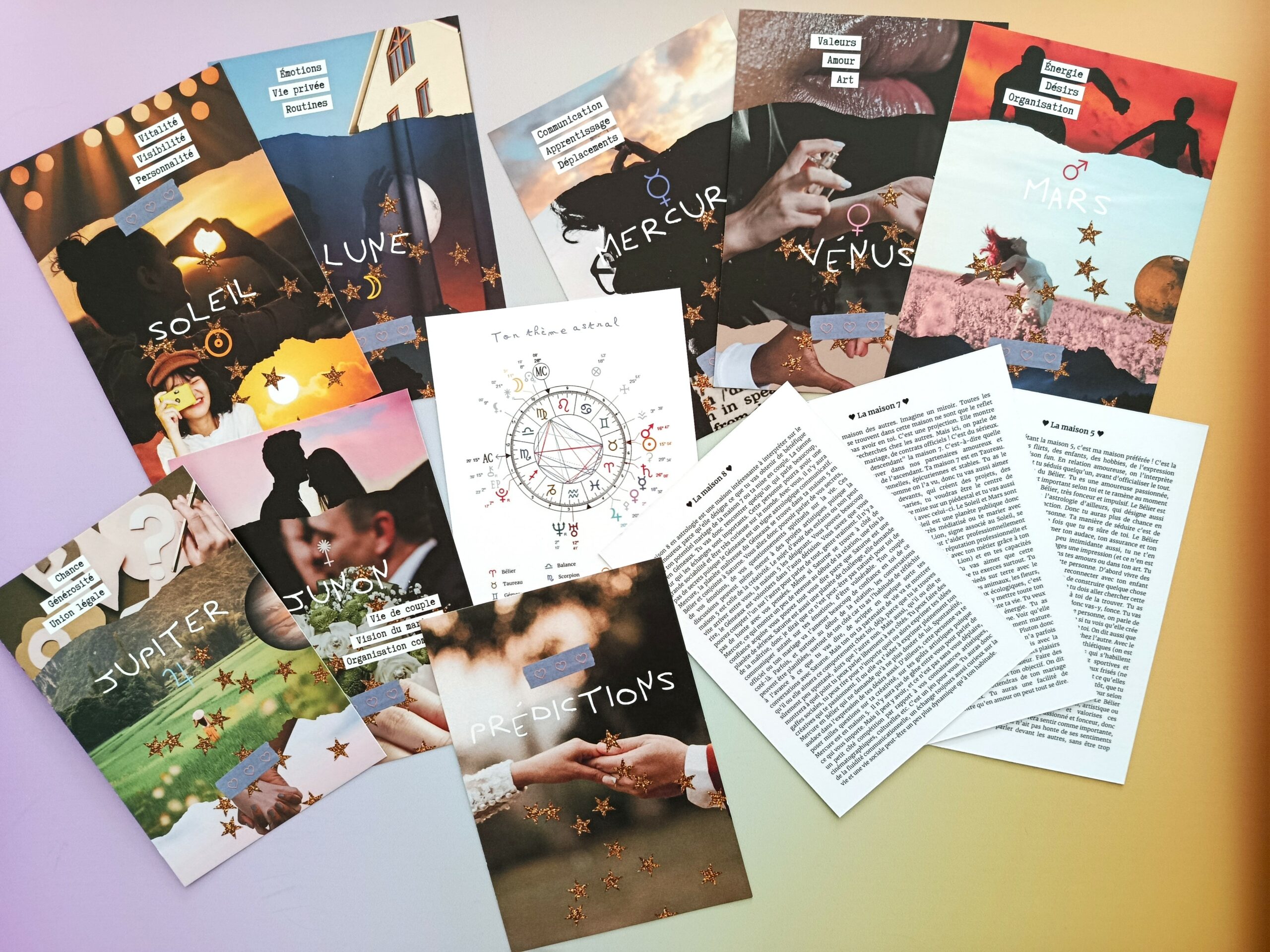 Ton thème astral interprété dans un carnet format a5 scrapbooking de 56 pages, alliant textes et visuels.