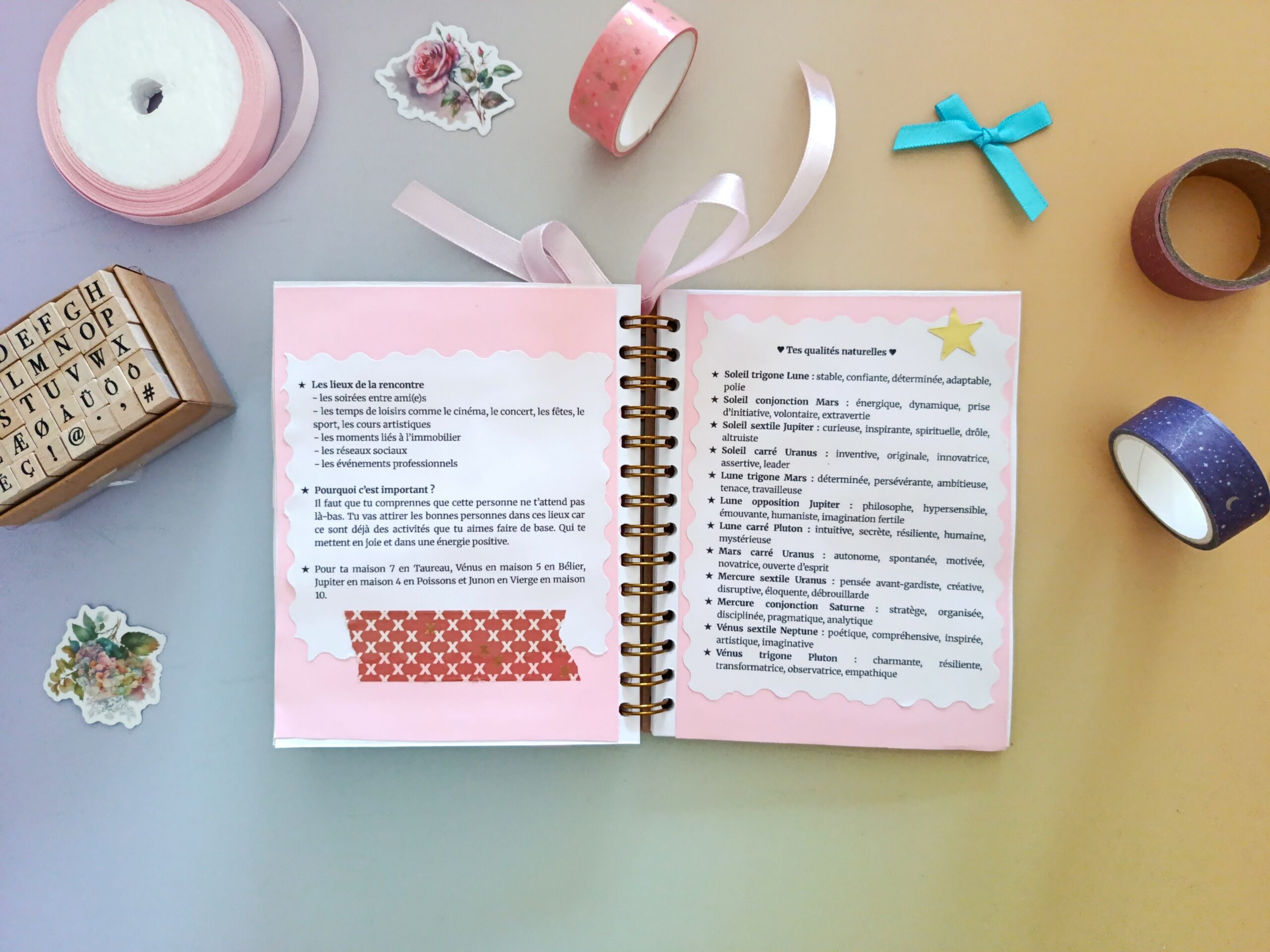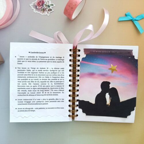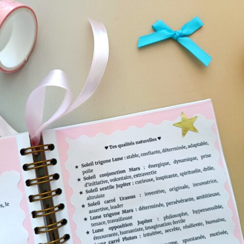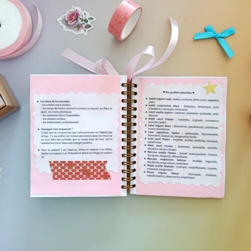 Ce carnet astrologique amour au format a6 de 36 pages révèle tes qualités relationnelles, tes pensées limitantes en amour et tes clés pour t’épanouir.
