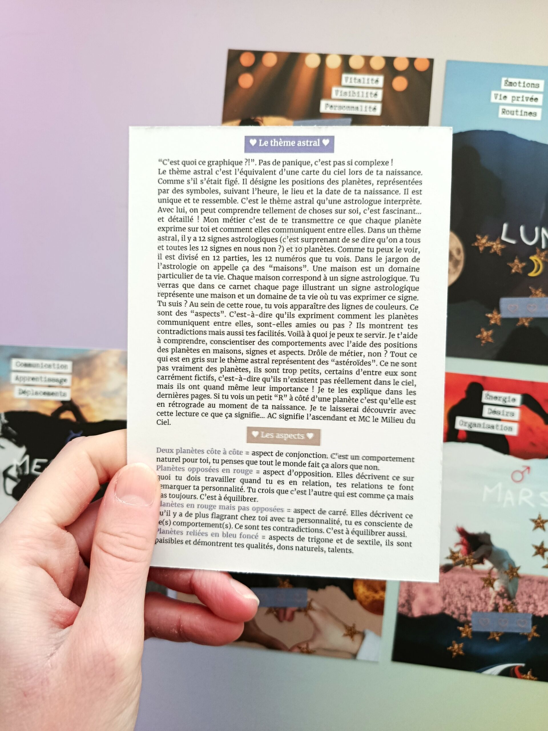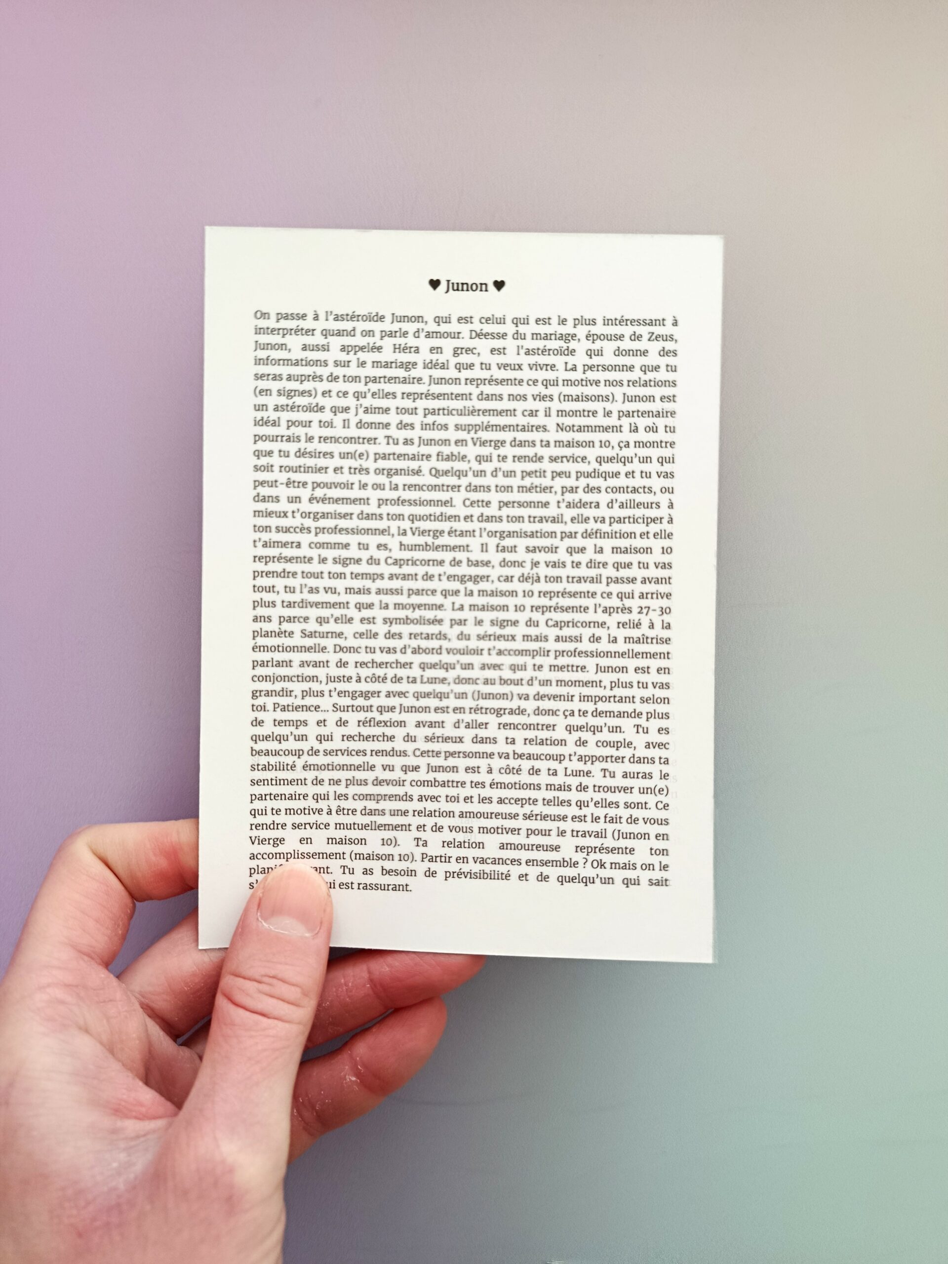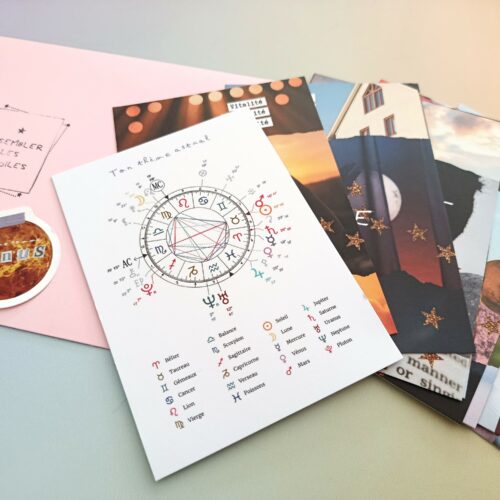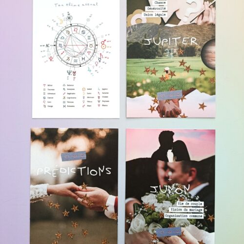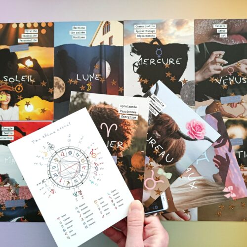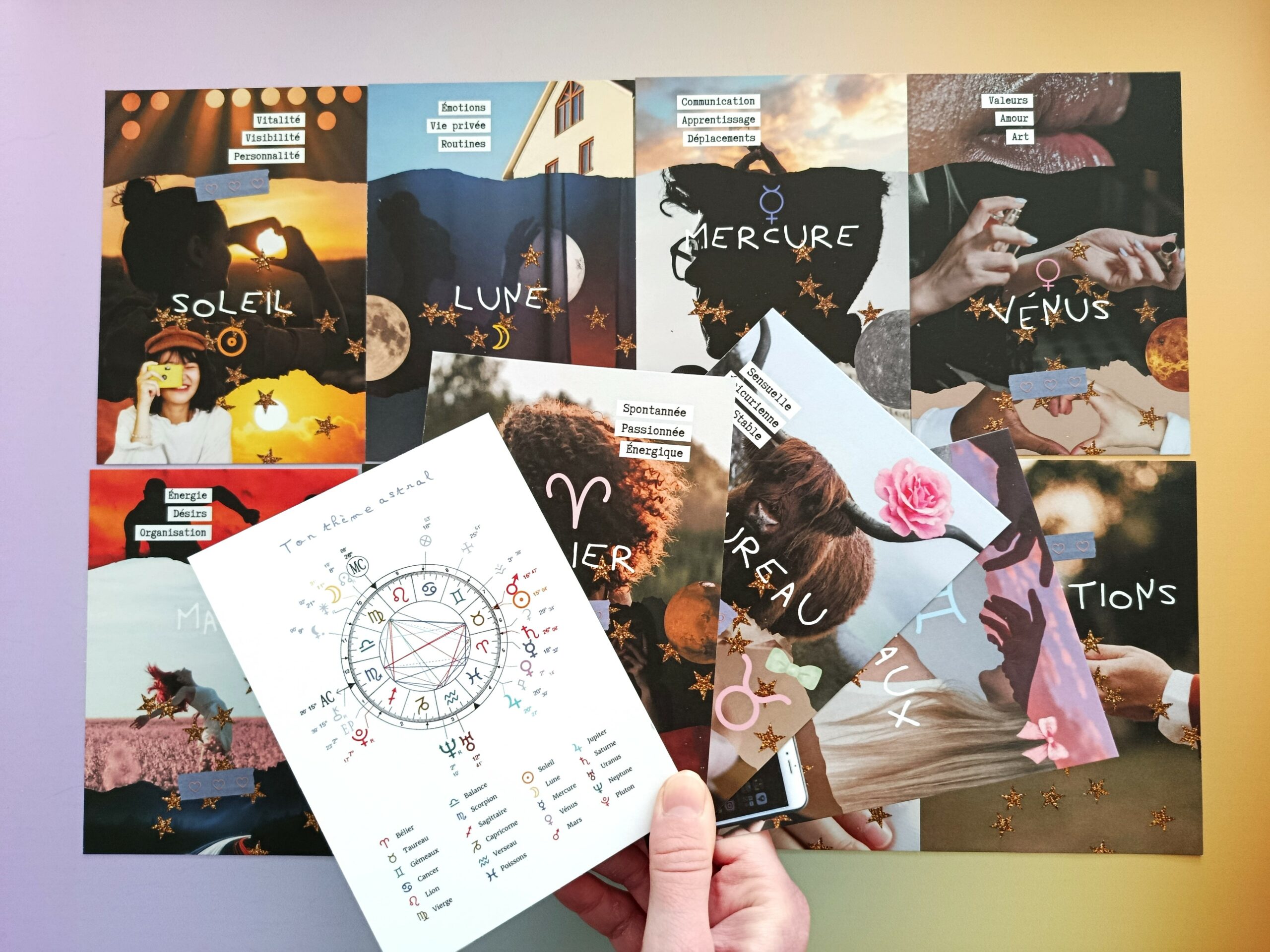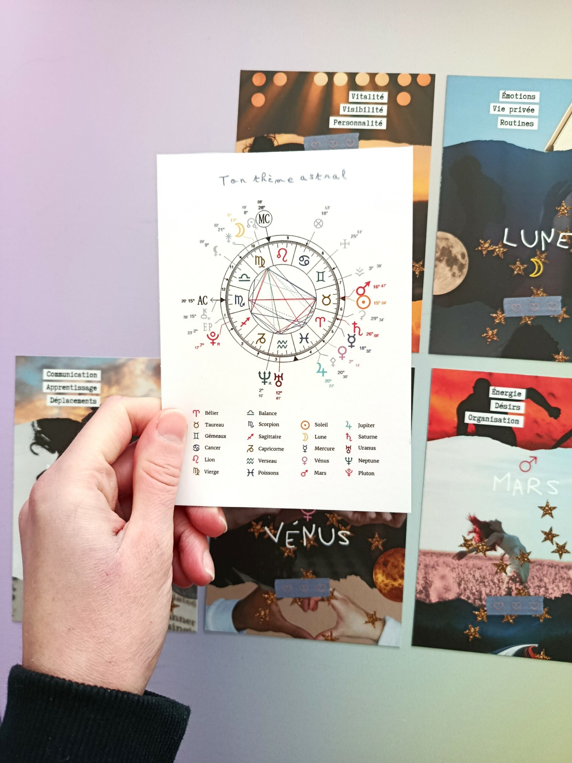 - 12 cartes a6 personnalisées recto verso : thème astral, soleil, lune, mercure, vénus, mars, jupiter, junon, prédictions, maison 5, maison 7, maison 8