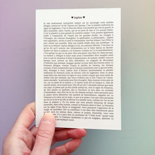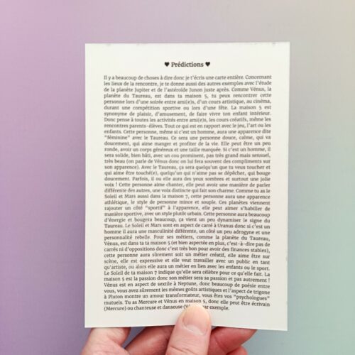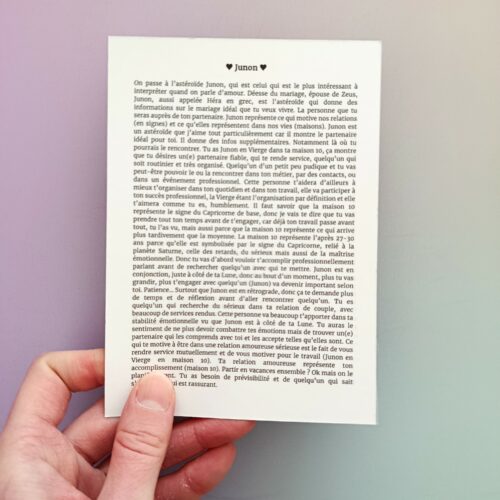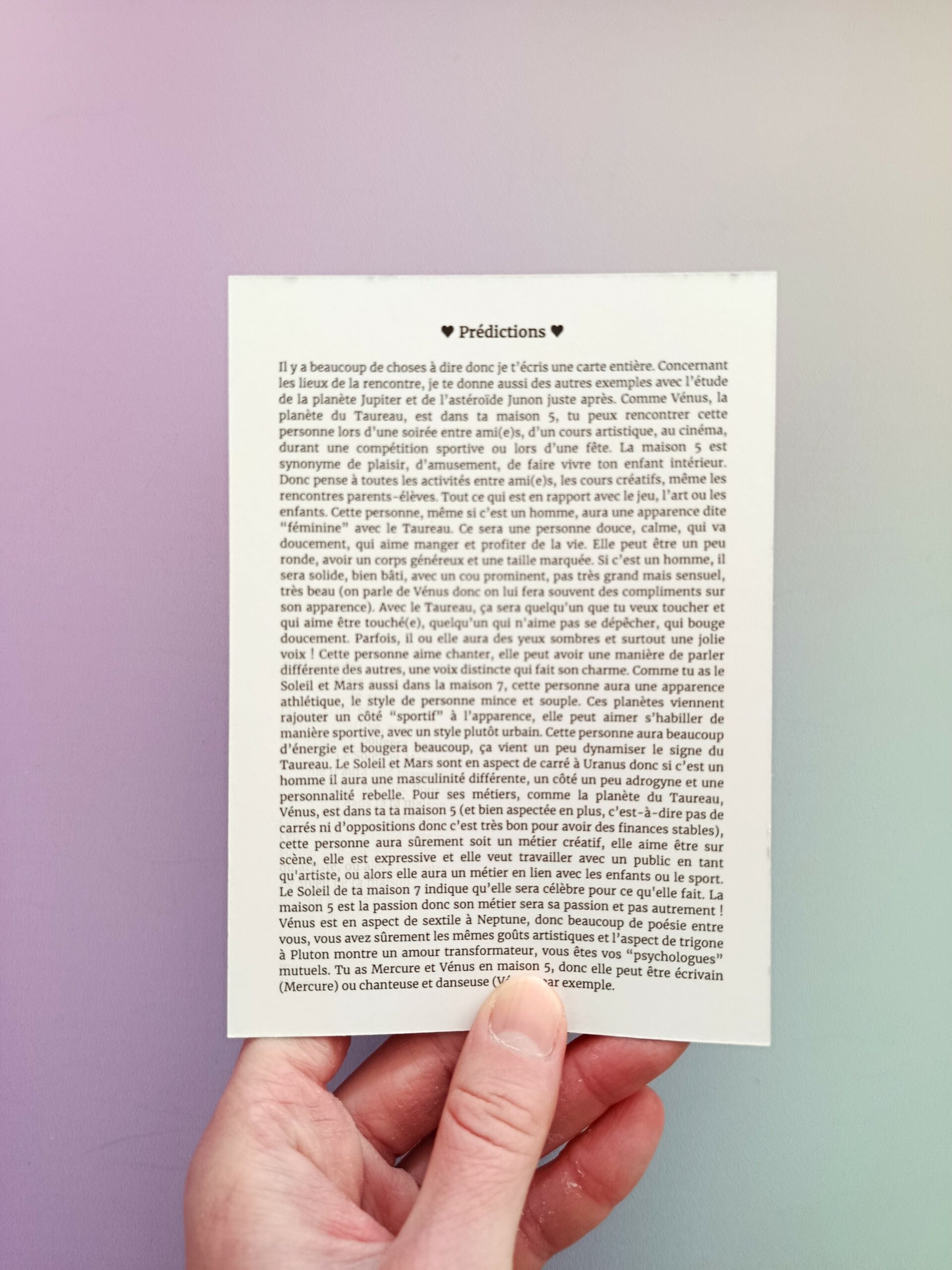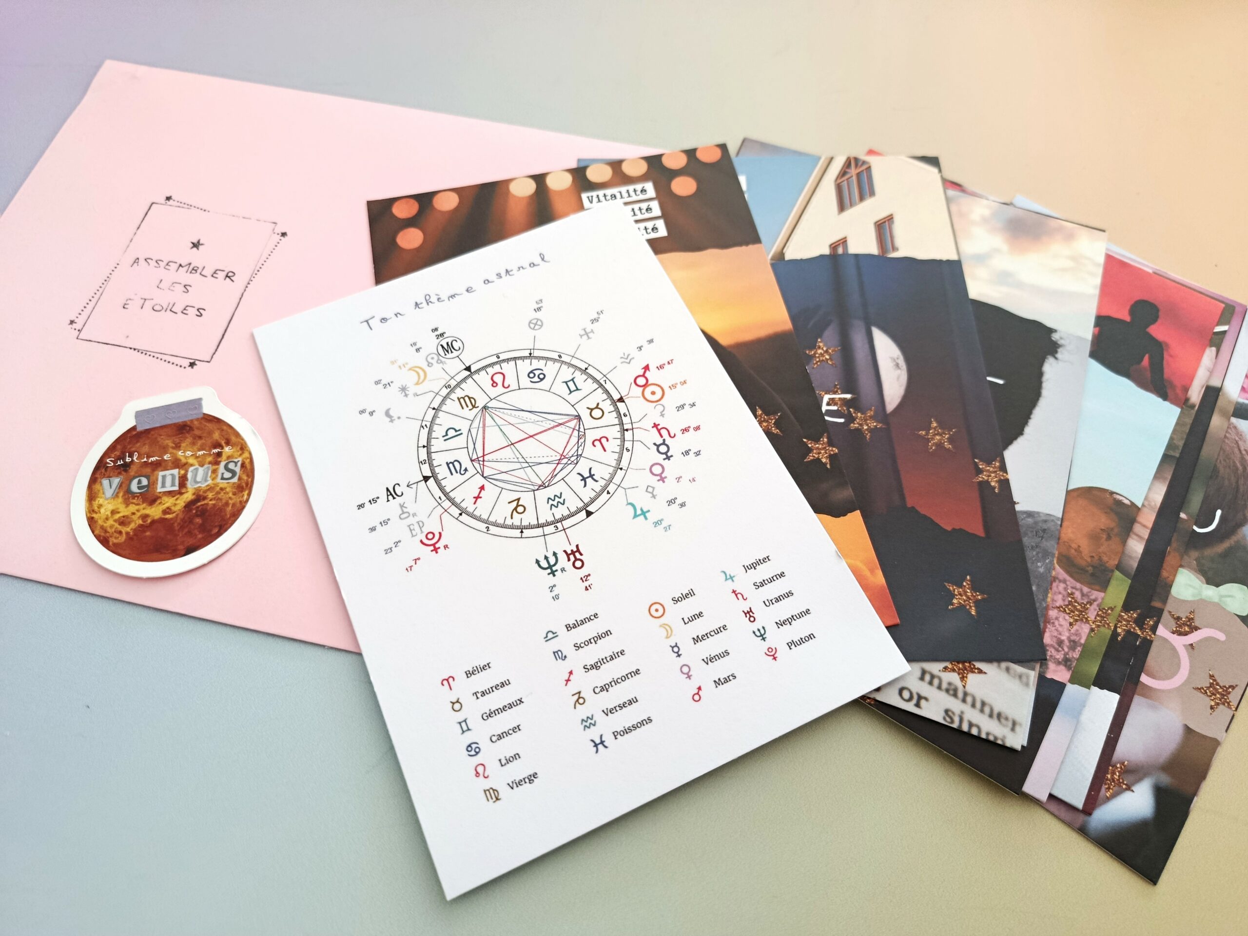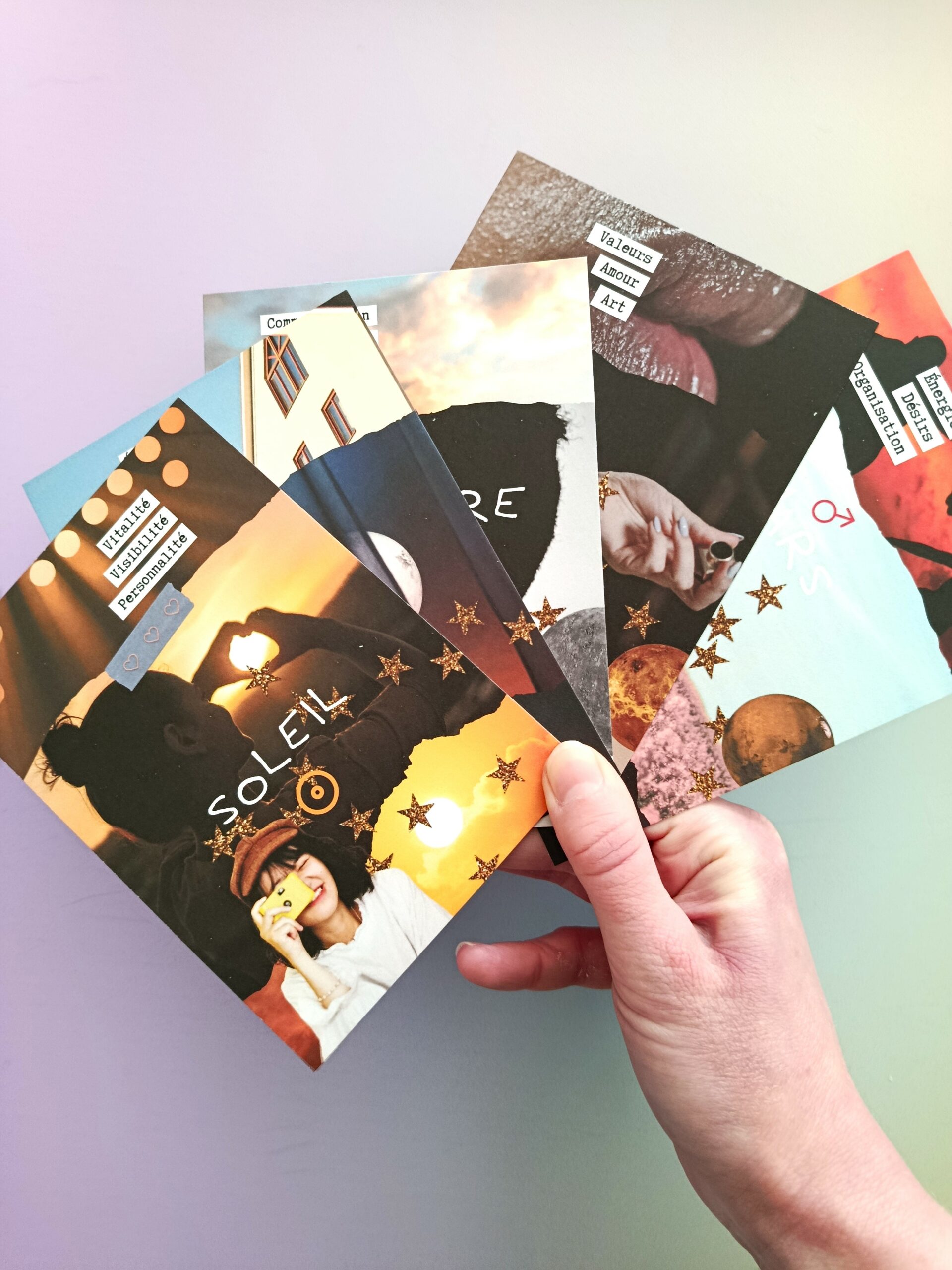 - 12 cartes a6 personnalisées recto verso : thème astral, soleil, lune, mercure, vénus, mars, jupiter, junon, prédictions, maison 5, maison 7, maison 8