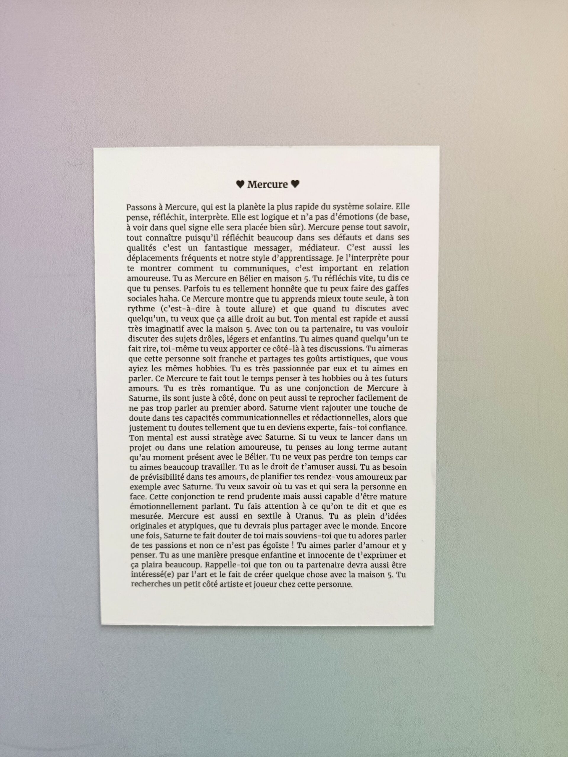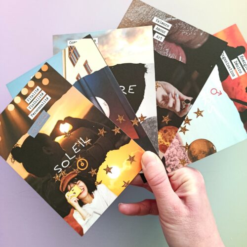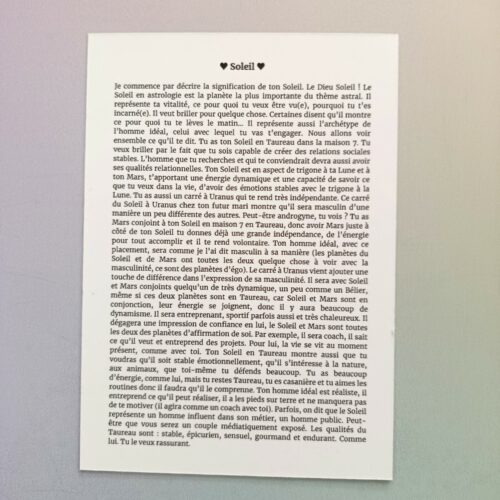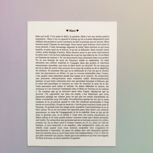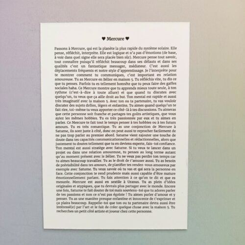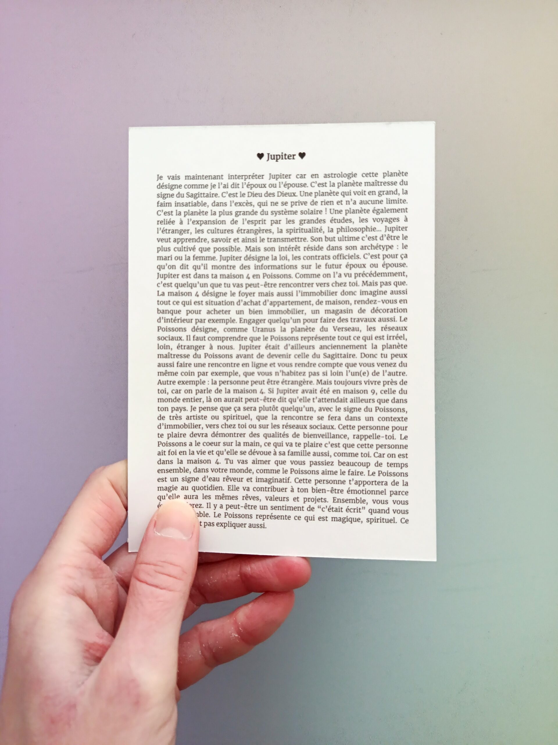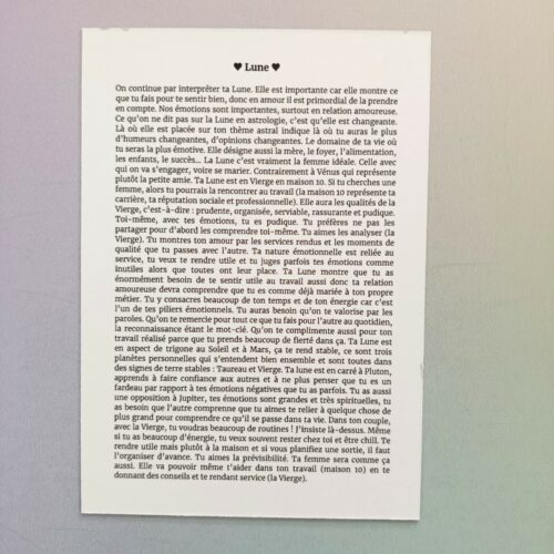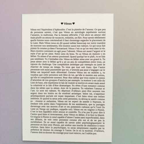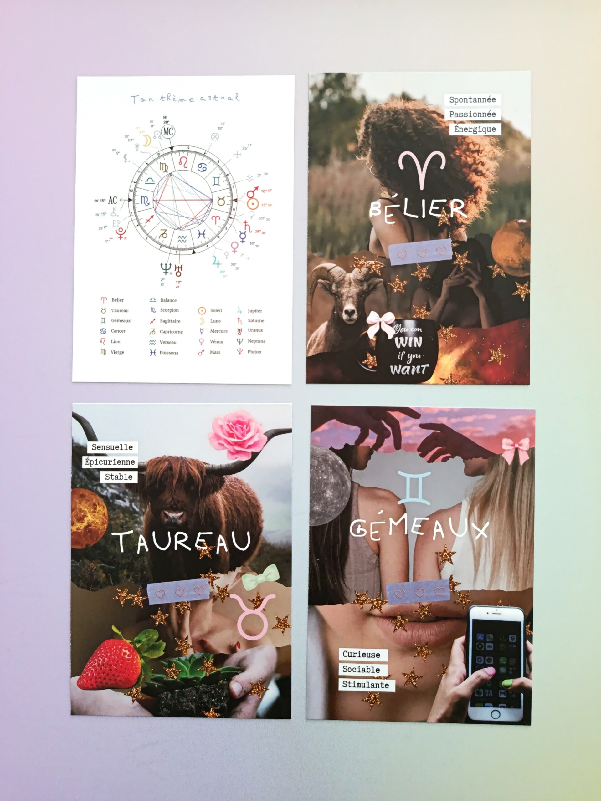 - 12 cartes a6 personnalisées recto verso : thème astral, soleil, lune, mercure, vénus, mars, jupiter, junon, prédictions, maison 5, maison 7, maison 8